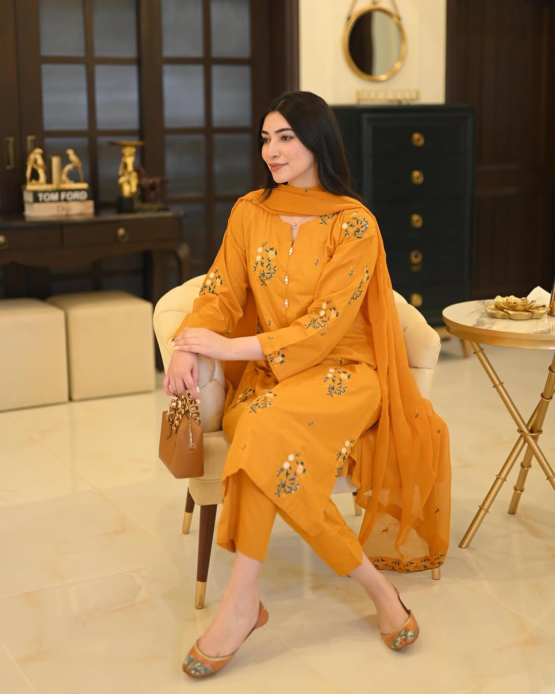 কালার: ডিপ ইয়োলো ব্যাকগ্রাউন্ডে ফুলের ডিজাইন এমব্রয়ডারি করা।সেটের মধ্যে অন্তর্ভুক্ত: